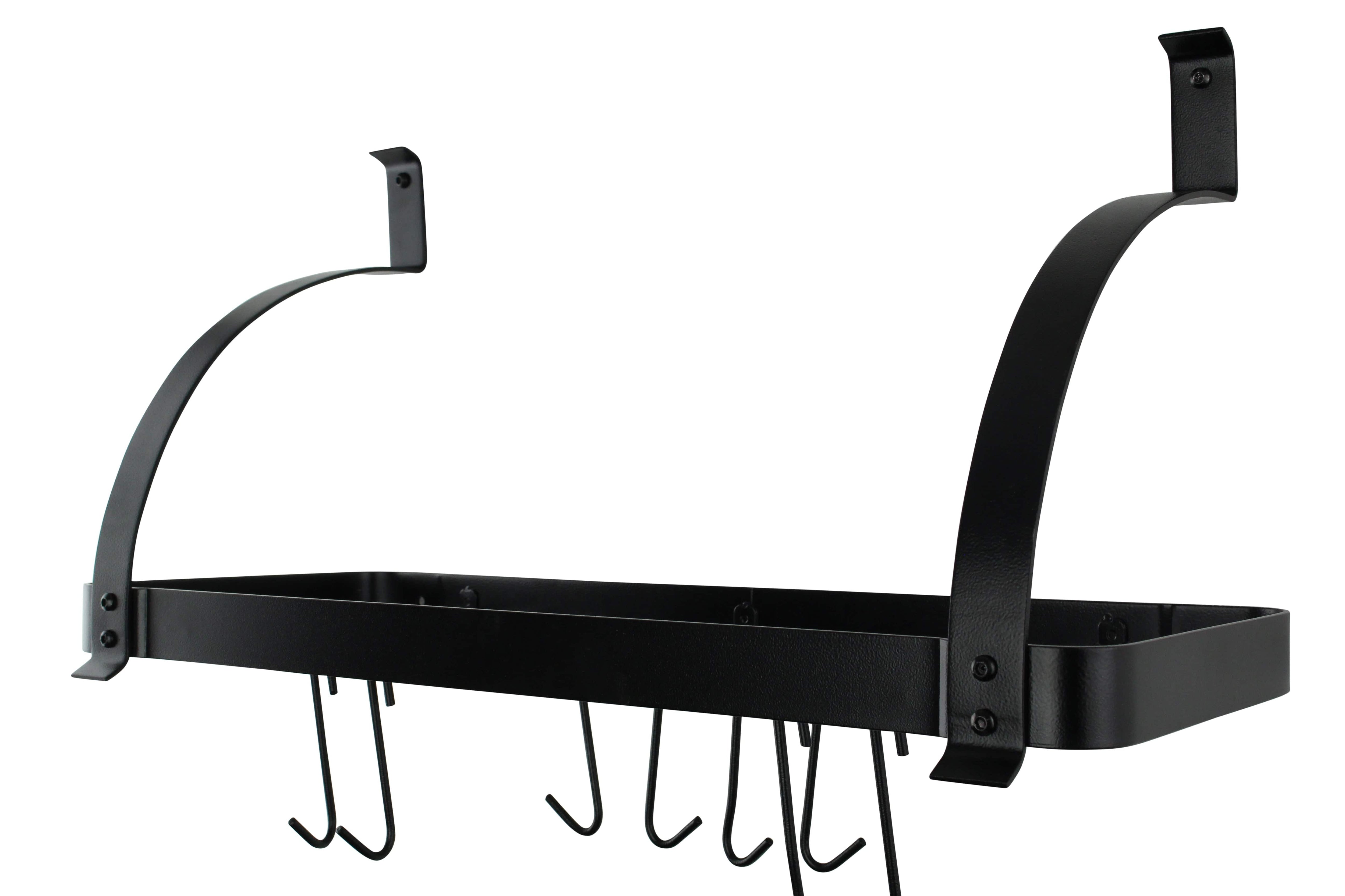 The Rack It Up! 24" Curved Arm Bookshelf Pot Rack has a solid, welded rectangle for strength and easy assembly. With this wall mounted rack you'll be able to organize your favorite pots, utensils, plants, canisters and spices for easy access. The curved arms allow for extra protection when storing items towards the end of your rack. Save precious counter and cabinet space and keep your kitchen accessories organized and accessible. This rack includes 8 pot hooks and hardware necessary for assembly and installation.