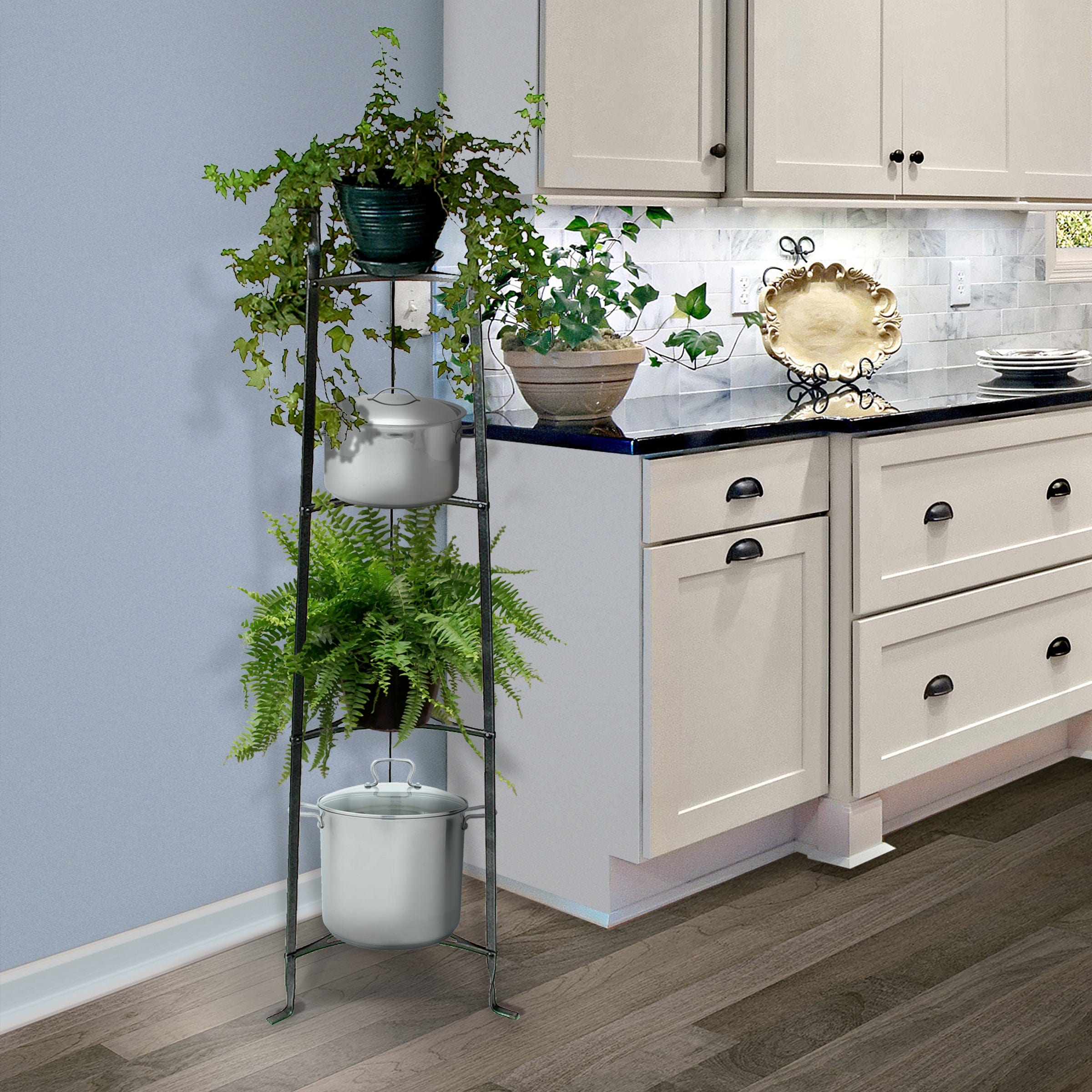 Handcrafted in the USA, this Enclume® 4-Tier Designer Stand is one of our best selling stands. Beautifully designed, this tapered stand is 53.5" tall and incredibly versatile. It is great in the Kitchen, in Outdoor Living Spaces, or just about anywhere. It displays and organizes plants, cookware, bakeware, pots, pans, herbs, pictures, or flowers. Use it as a pot rack or organizer when wall or ceiling space is not available. Each rack is forged from solid steel using traditional French metalworking techniques. It comes fully assembled and is cold riveted for strength and durability. The Hammered Steel is beautiful and authentic, not powder coated, painted, or plated. The assembled rack is ready to be displayed right out of the box. Optional Solid Alder Shelves are available and designed specifically to fit each of the shelves for added beauty and stability of your items. The choice of chefs, home professionals, and designers. For custom sizes or questions, contact Enclume Design Products directly.
