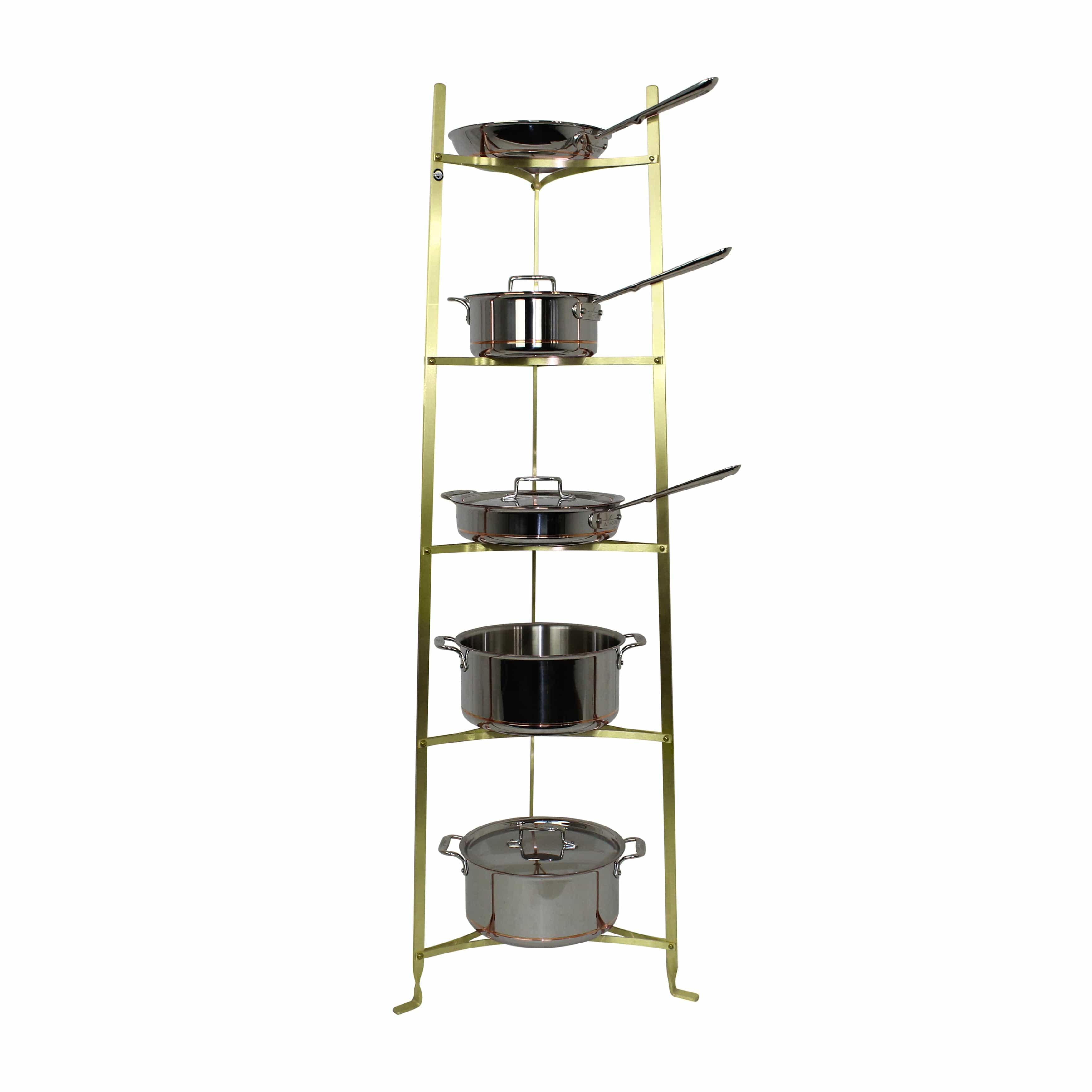 Handcrafted in the USA, this Enclume 5-Tier Gourmet Stand is exclusive to Williams-Sonoma. This tapered stand is incredibly versatile in the Kitchen, in Outdoor Living Spaces, or anywhere in your home. It displays and organizes cookware, bake ware, pots, pans, herbs, plants, pictures or flowers. Each rack is forged from solid steel using traditional French metal working techniques by Enclume craftsmen. Optional Solid Alder Shelves (Item# WSS5 SET) are available and designed specifically to fit each of the shelves for added beauty and stability of your items. Assembly instructions with all hardware and tools are provided. The assembled rack is ready to be displayed right out of the box. The finish is Brass, beautiful and authentic.