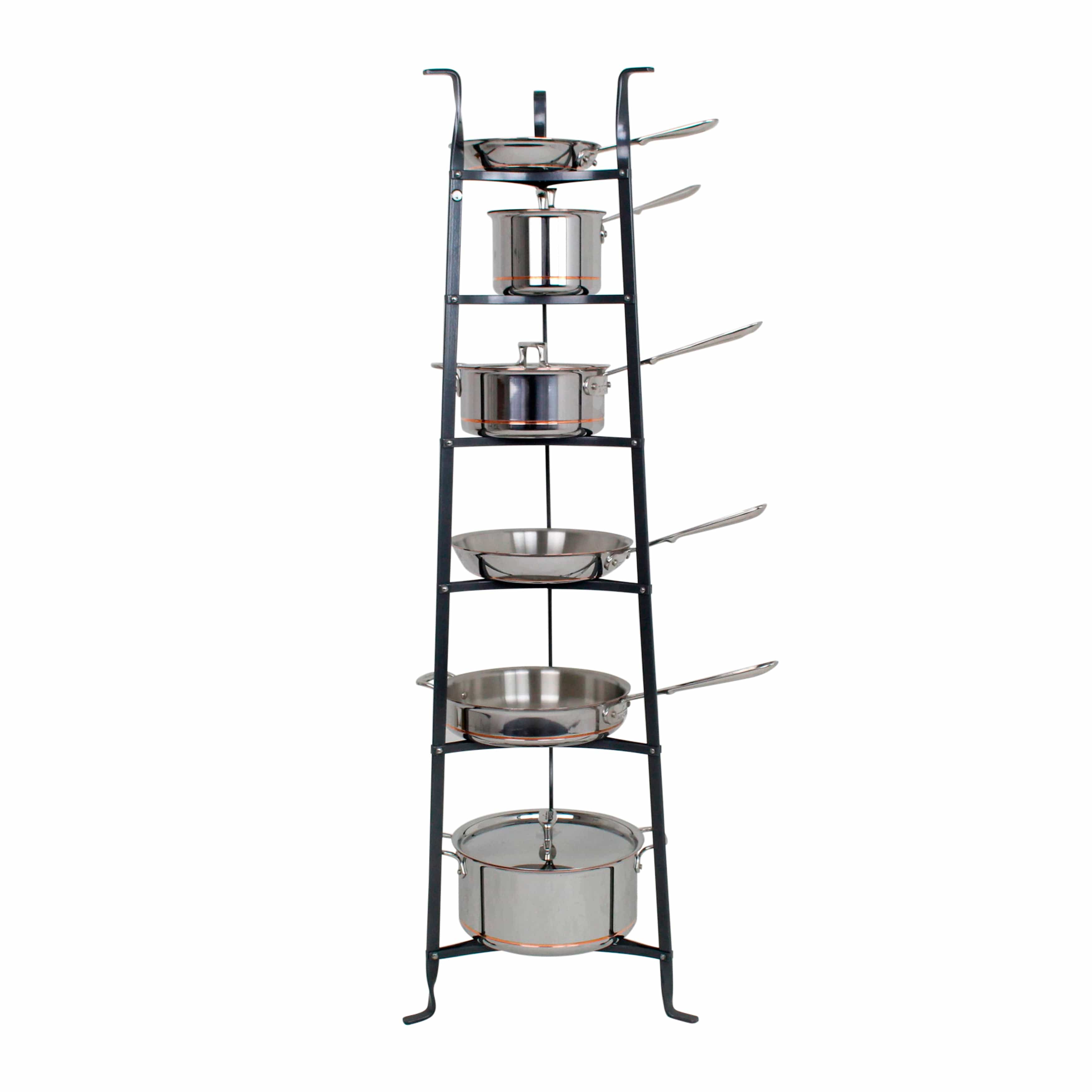 Handcrafted in the USA, this Enclume Gourmet 6-Tier Cookware Stand is one of our best selling stands. Beautifully designed, this tapered stand is 53.5" tall and incredibly versatile. It is great in the Kitchen, in Outdoor Living Spaces, or just about anywhere. It displays and organizes plants, cookware, bakeware, pots, pans, herbs, pictures or flowers. Use it as a pot rack or organizer when wall or ceiling space is not available. Also known as our Le Crueset or All-Clad stand by many consumers. You can also use it for heavy cast iron cookware such as Finex and Lodge. Each rack is forged from Solid Steel using traditional French metal working techniques. The Finish is powder coated for lasting beauty. Optional Solid Alder Wood Shelves are available and designed specifically to fit each of the tiers for added beauty and stability of your items. Assembly instructions with all hardware and tools are provided. For custom sizes or questions, contact Enclume Design Products directly.
