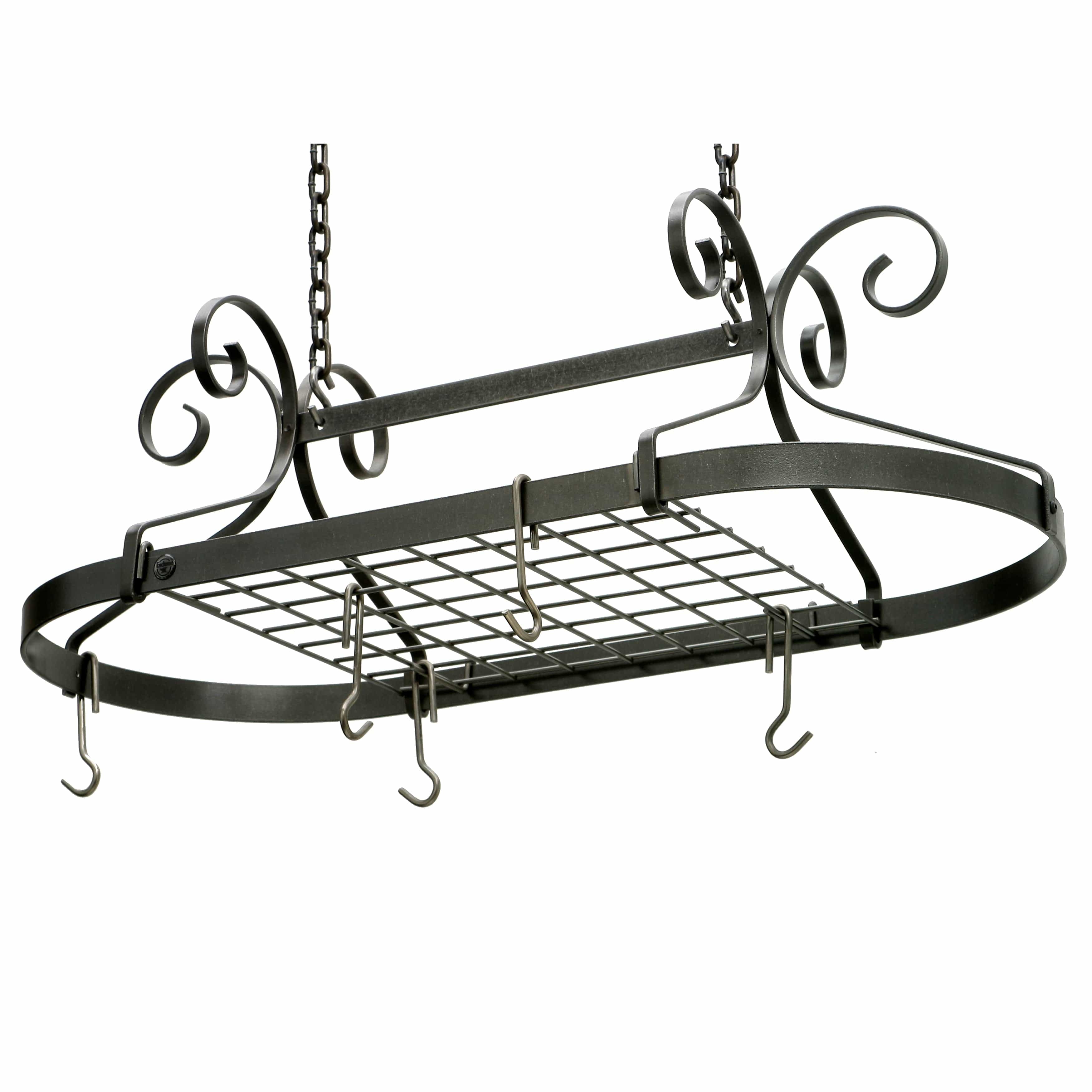 The Enclume Scrolled Oval Pot Rack with Hammered Steel Finish is a stylish and decorative kitchen storage solution, handcrafted in the USA. Here are some key features and details about this ceiling pot rack: Materials - The pot rack is constructed from high-quality Carbon Steel. This material is known for its strength and durability. The hammered steel finish adds a unique and authentic finish. Design - The Scrolled Oval design of this pot rack is not only functional but also decorative. It features an elegant and stylish look that can enhance the overall aesthetics of your kitchen. Included Accessories - This pot rack comes fully assembled and includes several accessories to help you organize your kitchenware. It comes with a grid, 4 grid brackets, 12 straight Multi-Purpose Pot Hooks, 2 S-Hooks, 2 pieces of 6" Decor Chain, and 2 Ceiling Screw Hooks. These accessories provide flexibility in how you hang and store your cookware. In summary, the Enclume Scrolled Oval Pot Rack is a combination of style and functionality. It's made from high-quality materials and features a distinctive hammered steel finish. The included accessories and easy installation make it a convenient and visually appealing addition to your kitchen, allowing you to efficiently store and display your pots and pans.