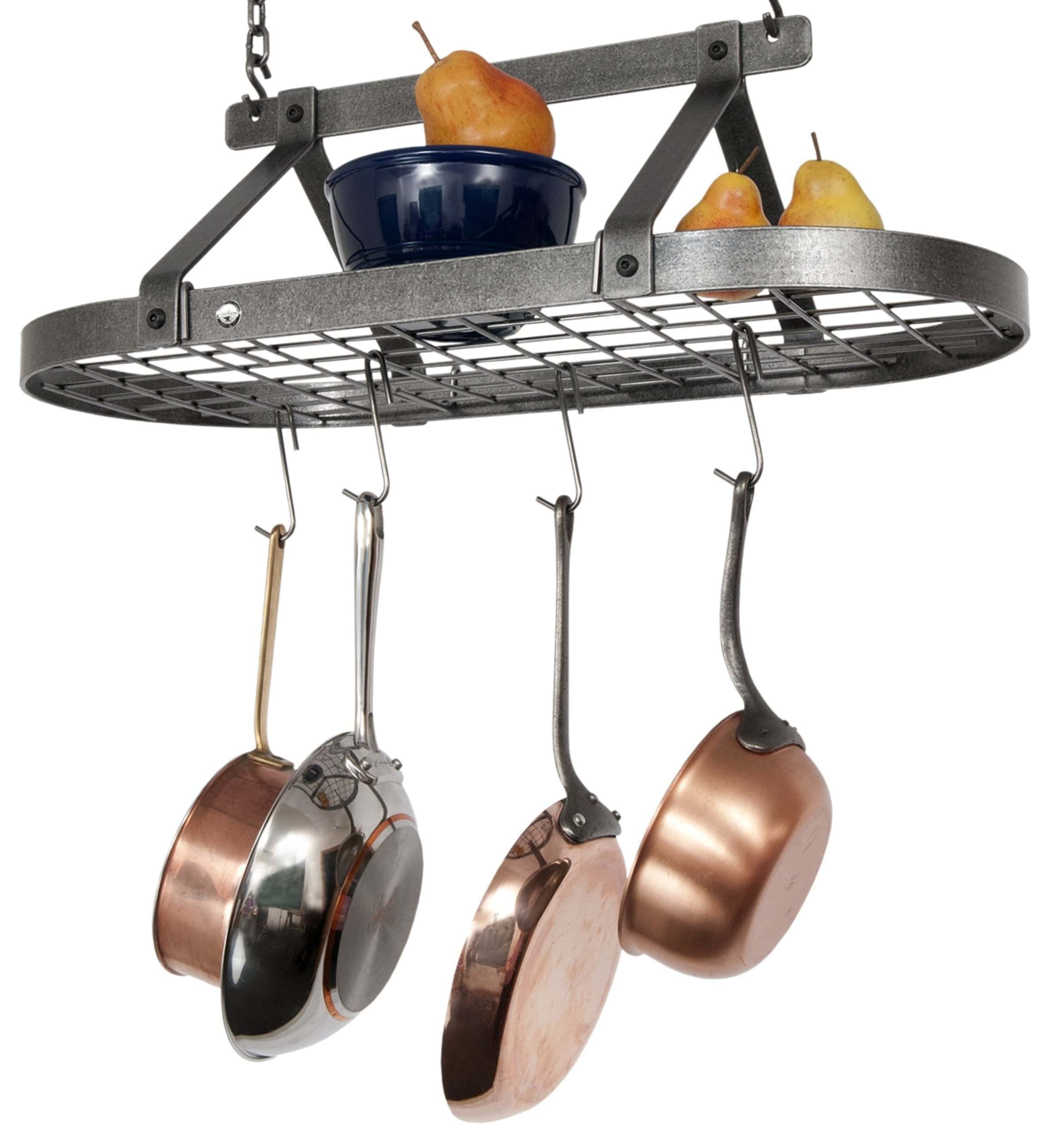 One of Enclume's most popular designs, this classic Enclume Oval Ceiling Pot Rack is Handcrafted in the USA. This hanging pot rack stores cookware within easy reach, saving cabinet space and creating the ambiance of a professional kitchen. Here are some key features and details about this ceiling pot rack: Materials - The rack is crafted from solid carbon steel or 304 Stainless Steel. Design - This hanging celiing rack is based on a French design which allows you to store your cookware and utensils in one place, making them easily accessible. This not only helps to save cabinet space but enhances the culinary environment in your kitchen with a simple yet beautiful design. Finish - The rack features Enclume's authentic finish highlighting its natural appearance. The aesthetics of the rack give it a contemporary yet modern industrial look. It is a favorite of many home chefs and culinary professionals. A standout piece in your kitchen decor.