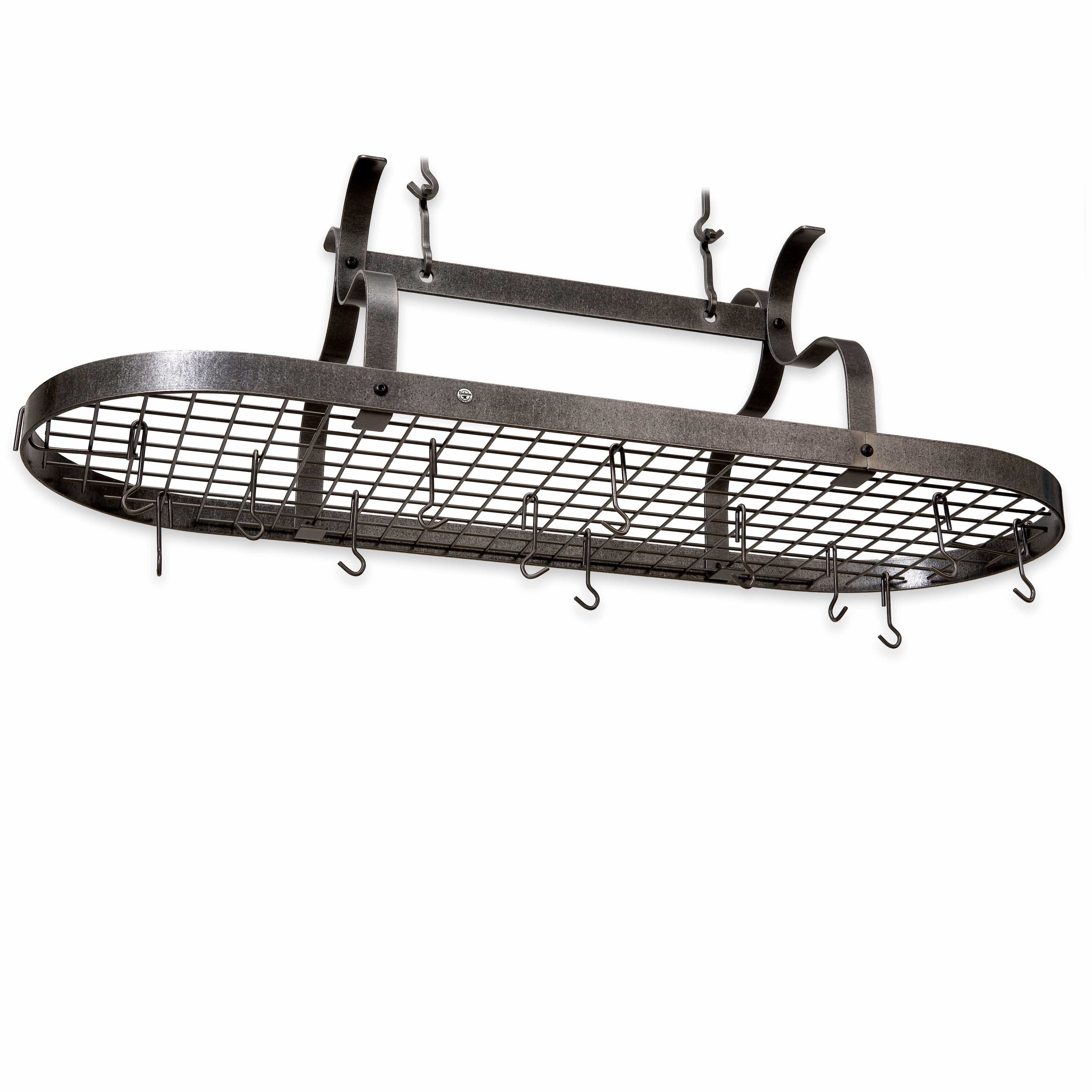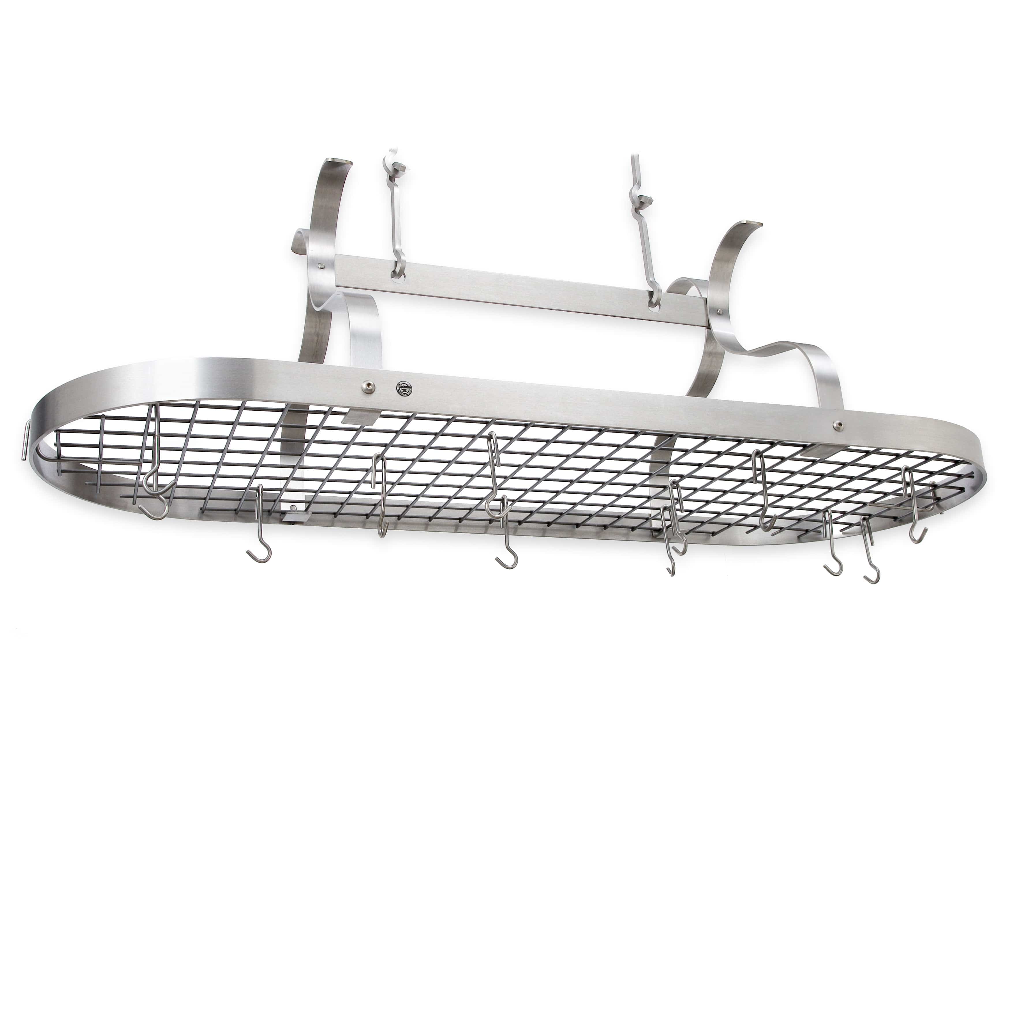 Handcrafted in the USA, this Enclume Scroll Arm Oval Ceiling Pot Rack measures 4-1/2 ft. long and nearly 2 ft. across to give you plenty of room to store all your pots and pans. Constructed of Real Solid Steel or superior 304 Stainless Steel. The finish is beautiful and authentic, not powder coated, painted or plated to provide durability and strength for lasting value and visual appeal. Part of the Premier Collection, this oval pot rack features scrolled arms that function as grid brackets for additional support. Assembly Instruction and Installation hardware are provided. Mounting directly into ceiling joists or beams is recommended. Consult your handyman or local hardware store for mounting to drywall or your specific ceiling type.
