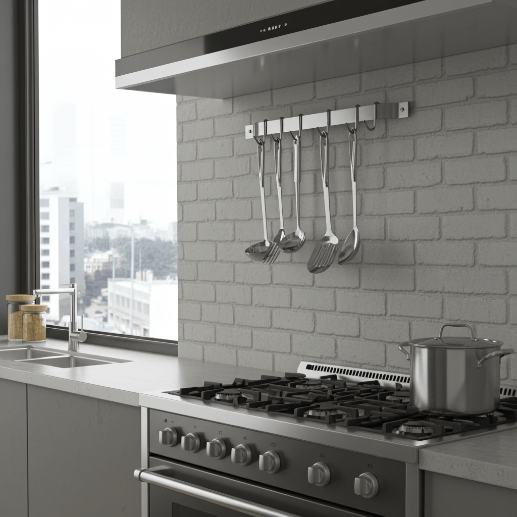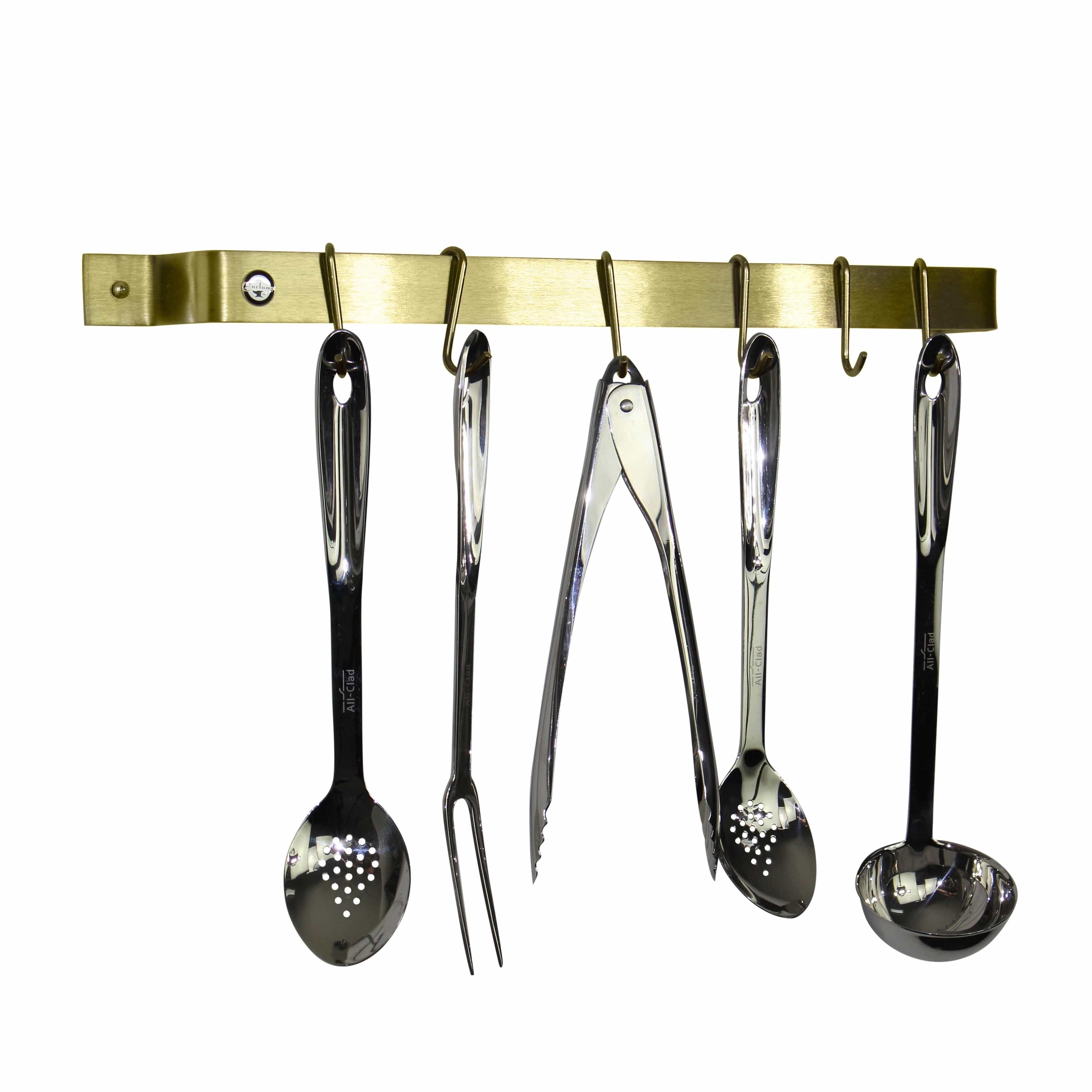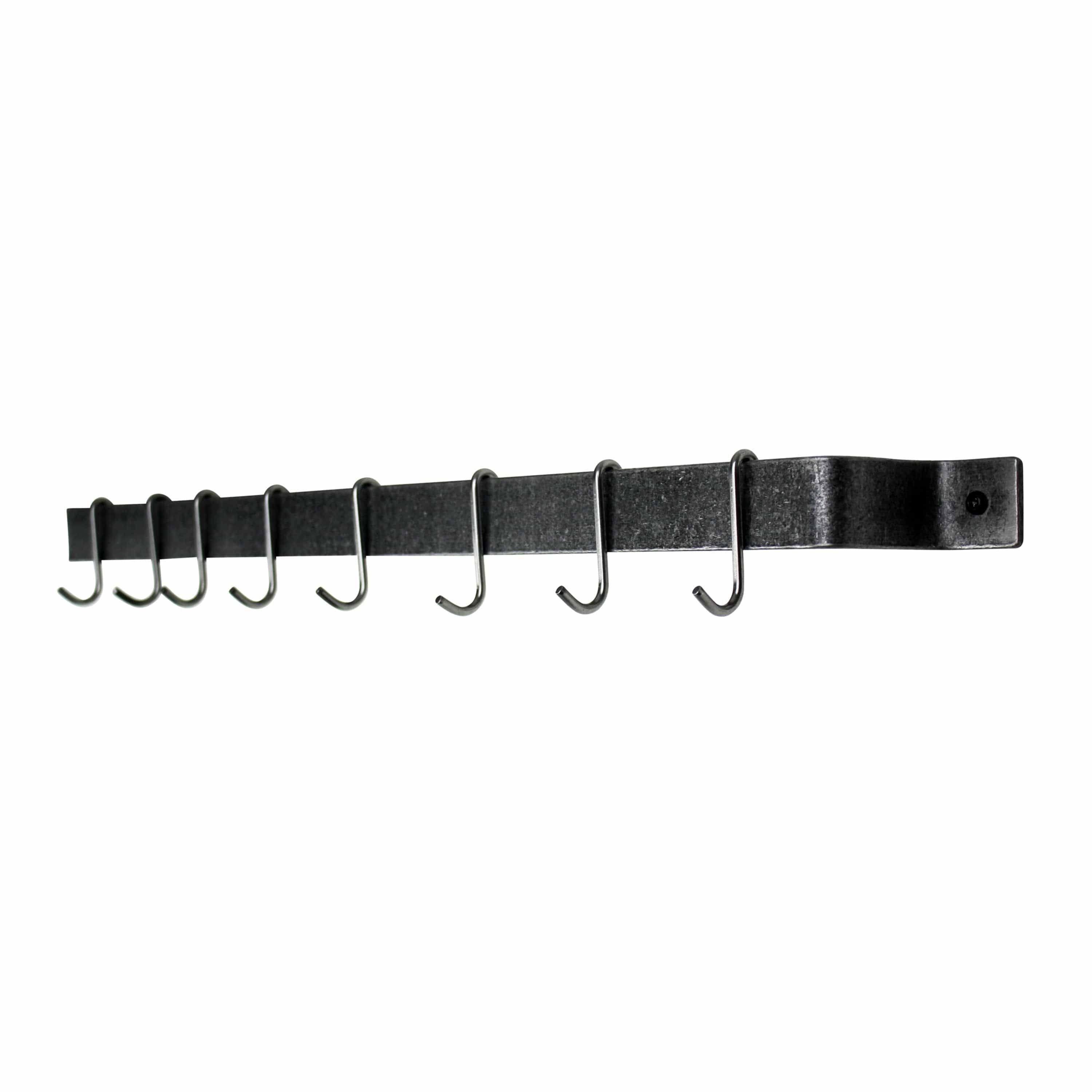 Handcrafted in the USA, this Easy Mount Wall Rack Utensil Bar will help get your cookware, utensils, pots, pans, mugs, towels or tools out of the drawer and up on the wall where you can organize and access them easily. A great solution for small spaces, urban living, and even your BBQ area. Includes 6 Straight Multi-Purpose Hooks. Hardware and instructions for recommended installation are included. Mounting directly into studs is recommended. Consult your handyman or local hardware store for mounting to your specific wall type. For custom sizes or if you have any questions, contact Enclume Design Products directly.